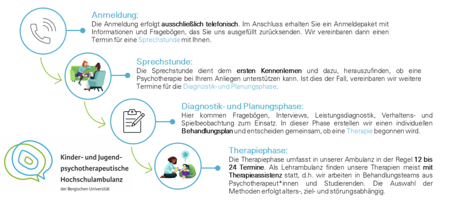 Die Kontaktaufnahme erfolgt bei uns ausschließlich telefonisch zu unseren festgelegten Sprechzeiten. Nach einem telefonischen Vorgespräch verschicken wir unser Anmeldepaket per Post. Erst, wenn wir alle Unterlagen von Ihnen ausgefüllt zurück erhalten haben, können wir Sie und Ihr Kind zu einer ersten, unverbindlichen Sprechstunde zu uns einladen. Im Anschluss an unser erstes Gespräch stimmen wir das weitere Vorgehen mit Ihnen ab. Wenn wir zu dem Schluss kommen, dass eine Psychotherapie bei Ihrem Kind voraussichtlich erforderlich ist und wahrscheinlich zu einer Verbesserung ihrer*seiner Probleme beitragen wird, vereinbaren wir weitere Termine, die dem näheren Kennenlernen und der eingehenderen Untersuchung und Diagnosefindung dienen. Das erste Gespräch soll Ihnen zudem die Gelegenheit geben, mögliche Fragen zu stellen, unsere Ambulanz kennenzulernen und ein Gefühl dafür zu bekommen, ob Sie sich eine Zusammenarbeit mit uns vorstellen können.